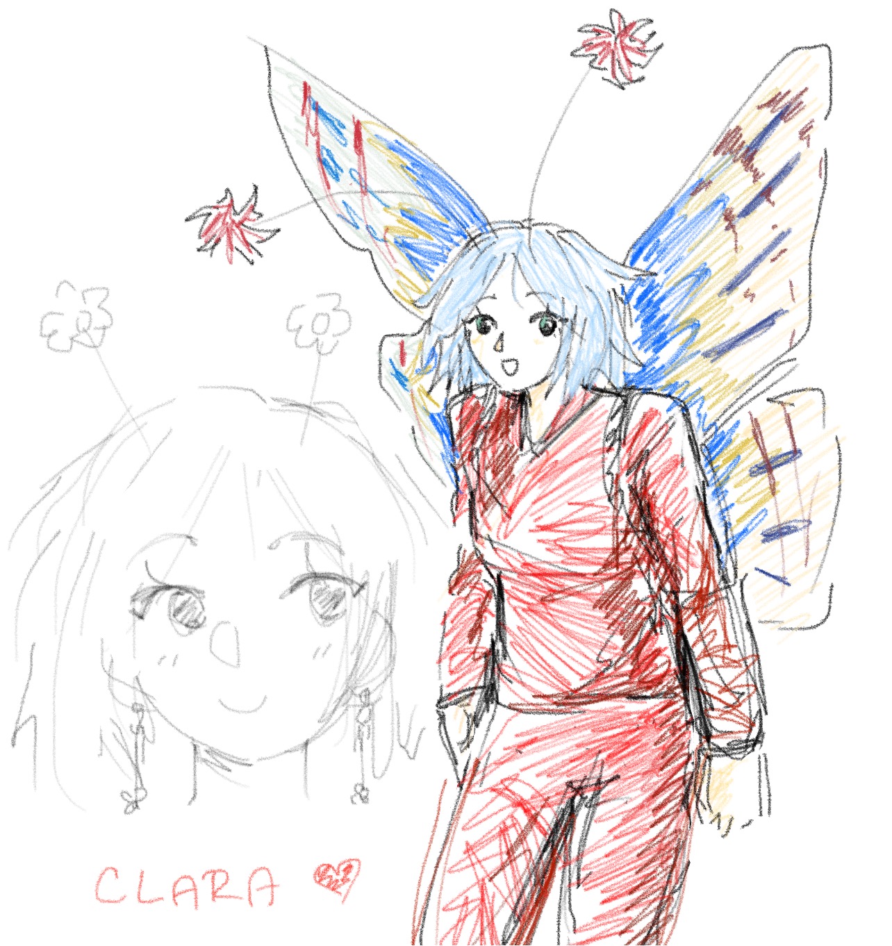 Clara's design is currently one of my favorites, but it took a couple of changes to get to what I have right now. My character creation process always starts with personality; this helps make a design that truly matches. However, 5 years ago I just drew whatever and called it a day. After learning to take inspiration from anything, it helped influence her current design and her completely different personality.